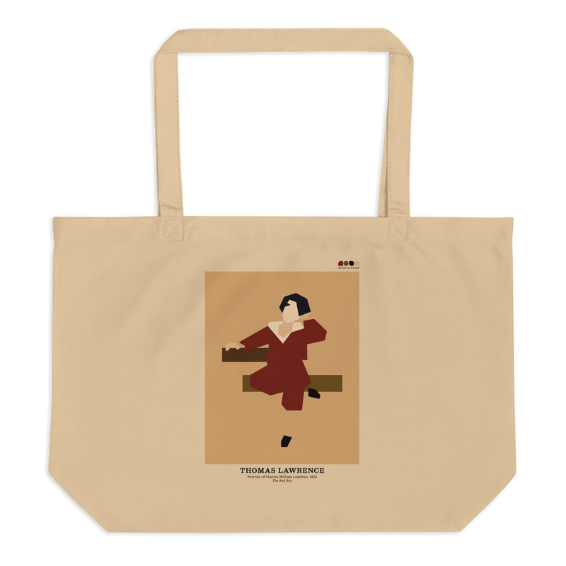 Guarda tus cosas en esta bolsa de algodón orgánico con un diseño geométrico inspirado en el Retrato de Charles William Lambton, de Thomas Lawrence, conocido como El Niño Rojo. Puedes elegir entre una bolsa estándar o grande , estampada o bordada , y tendrás espacio de sobra para la compra, libros y cualquier otra cosa.