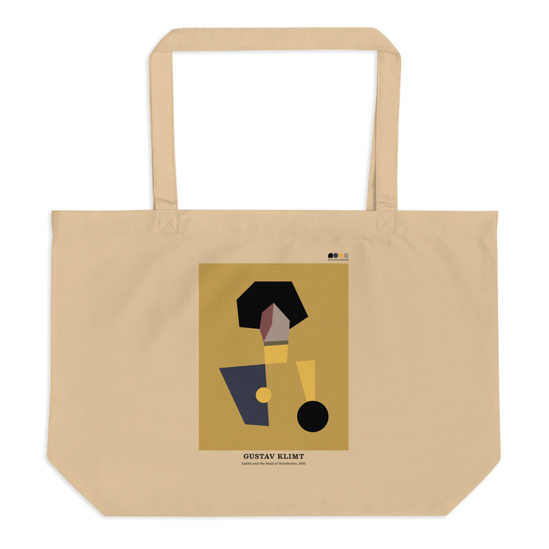 Bag your goodies in this organic cotton tote bag with a geometric design inspired by Gustav Klimt's Judith and the Head of Holofernes. With your choice of standard or large tote, printed or embroidered, there’s more than enough room for groceries, books, and anything in between.